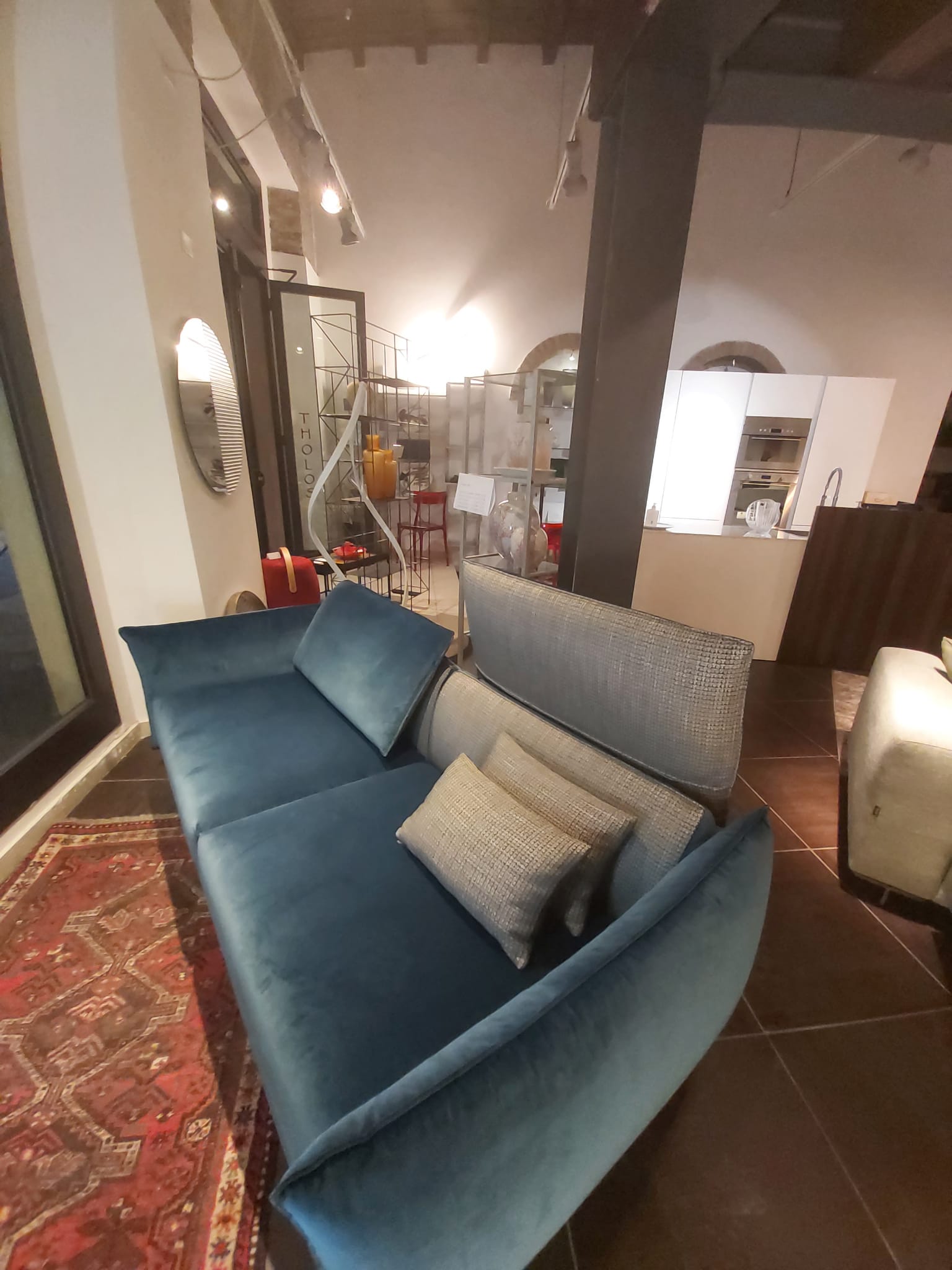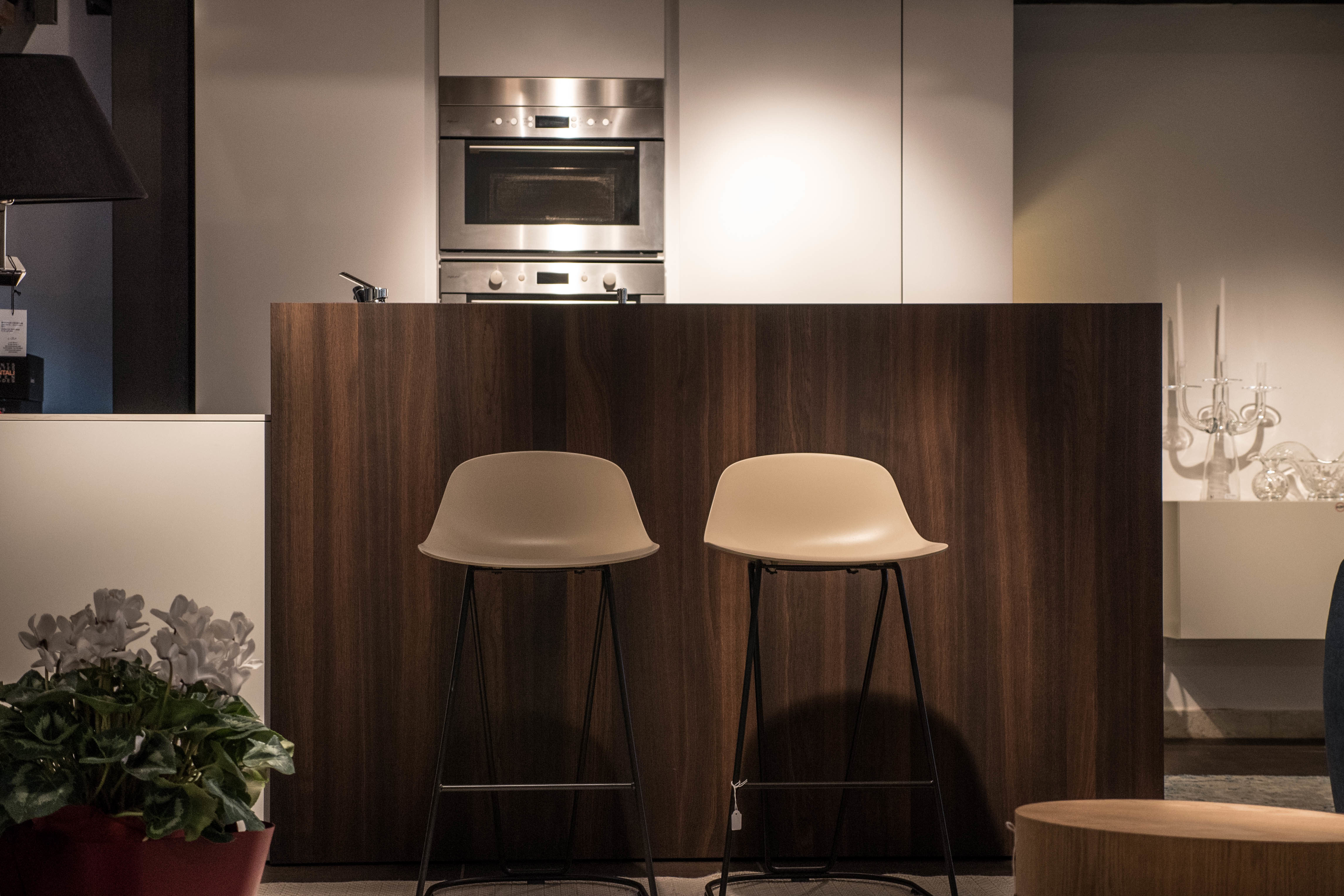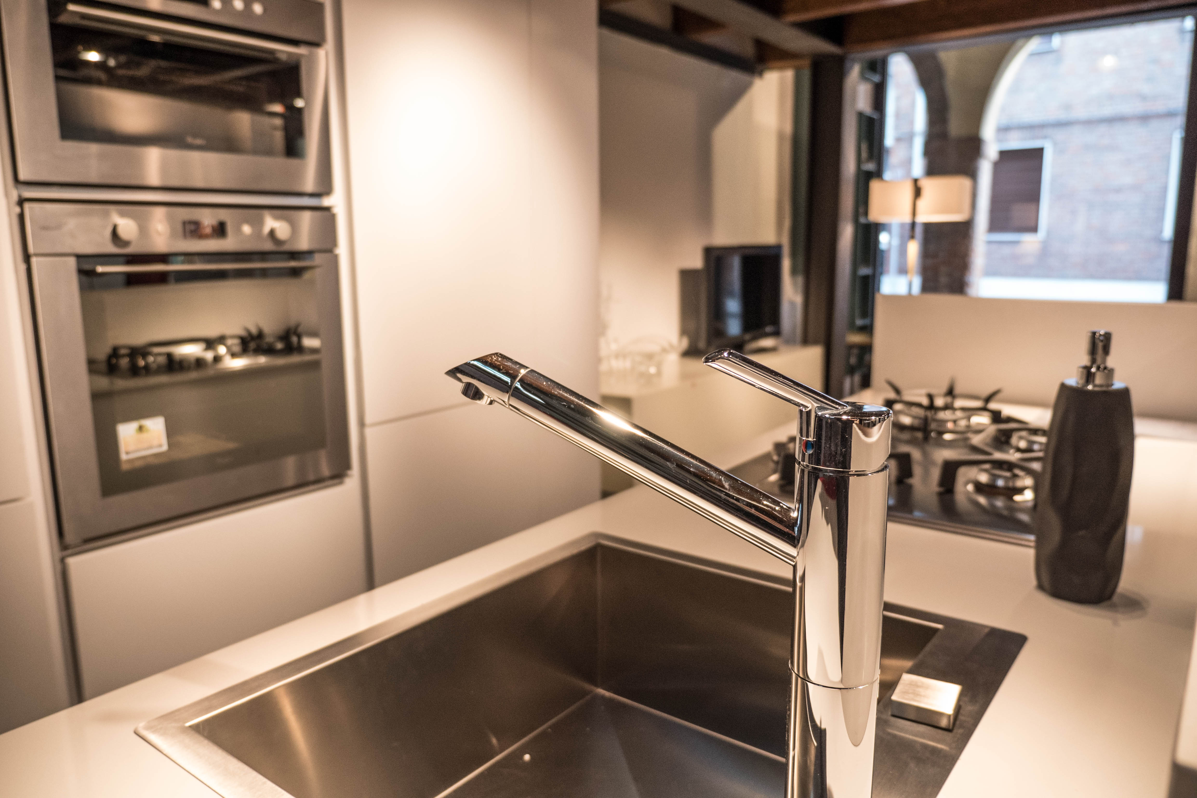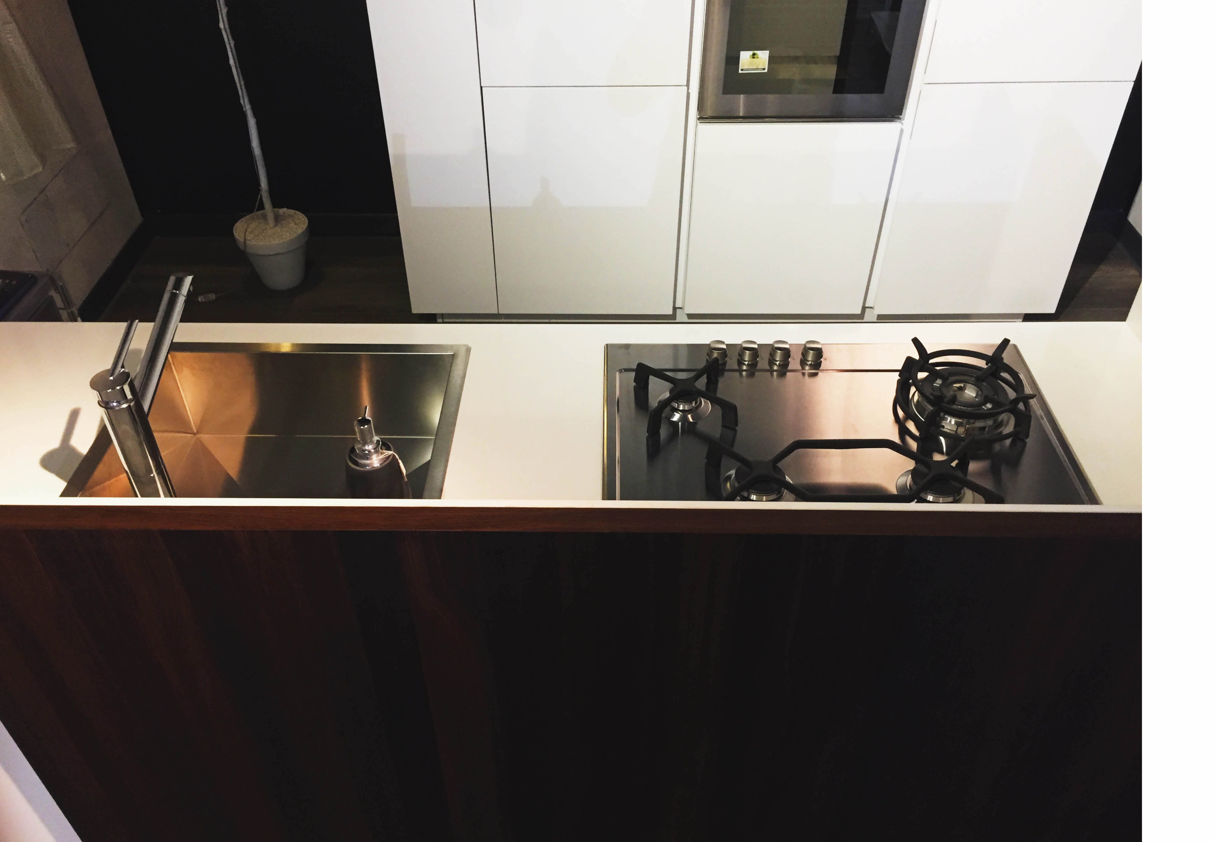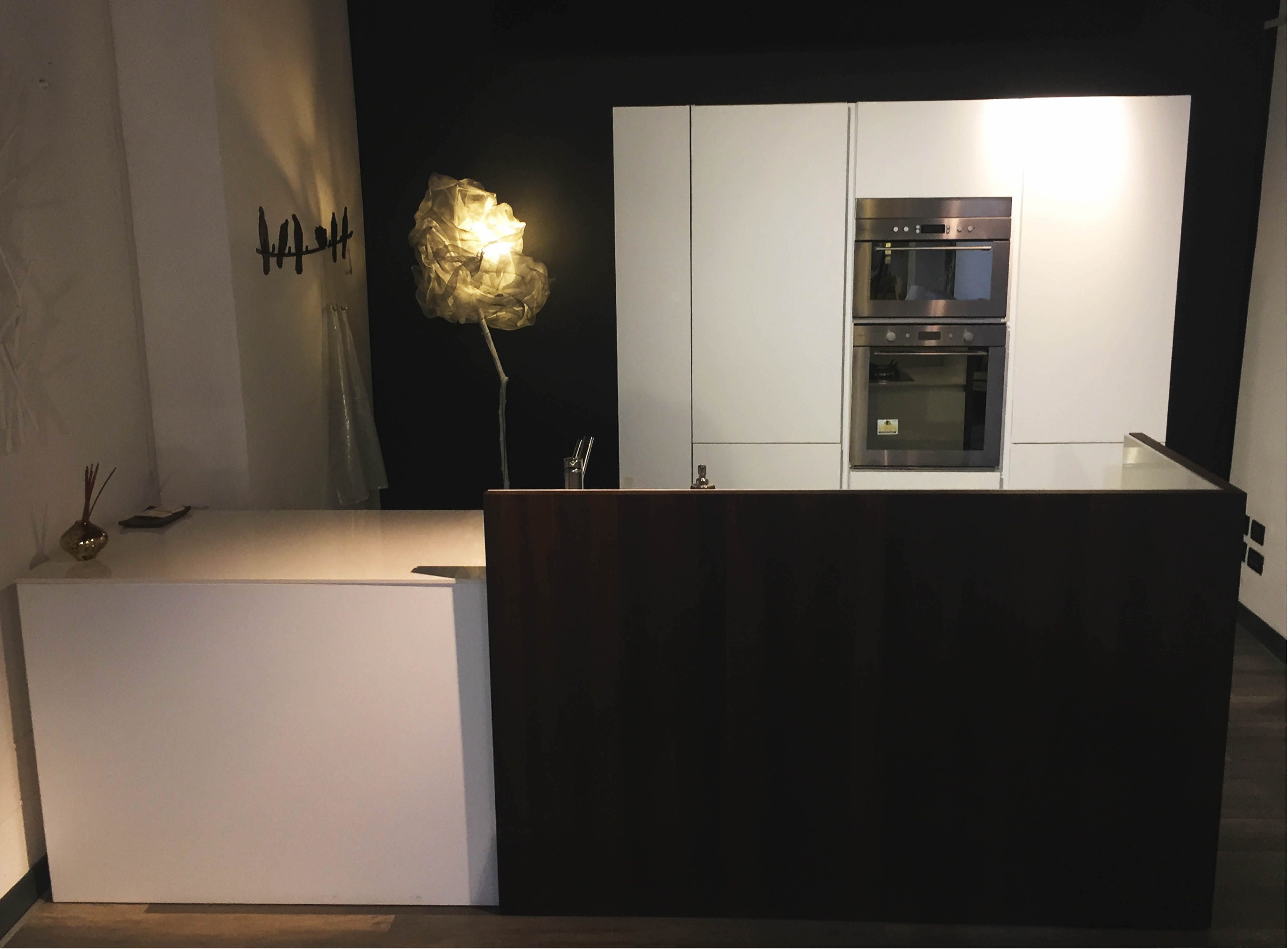 Top in quarzo, spessore 12mm. Ante laccate bianco opaco. Cucina composta da colonna a giorno laterale, colonna dispensa, colonna forno e colonna frigo. Isola profondità 75cm composta da base 120cm (due cassettoni, cassetto interno portaposate), base lavello, lavastoviglie e base dispensa. Pannello e colonna a giorno in rovere termocotto. Piano cottura da 73cm, forno, forno a microonde, frigo/congelatore Whirlpool, lavastoviglie AEG. Lavello e miscelatore Franke.